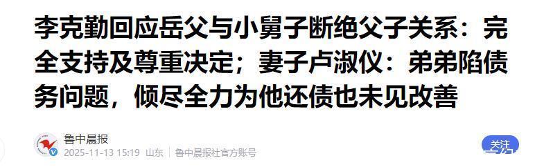 鲁中晨报——李克勤回应岳父与小舅子断绝父子关系:完全支持及尊重决定;妻子卢淑仪:弟弟陷债务问题,倾尽全力为他还债也未见改善